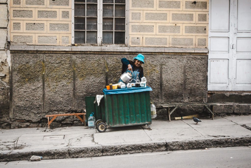 Mostly driven by a lack of capital to provide disposable cutlery, plates and cups to their customers, street food vendors in Bolivia, South America’s poorest country in terms of GDP p/c, have taken to serving their food and drink using normal crockery, and then washing it in a bucket on their stall between customers. Customers are either encouraged to eat their food on a bench provided by the vendor, or trusted to bring the crockery back later.